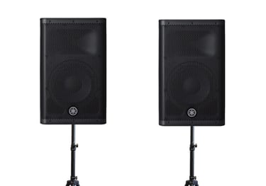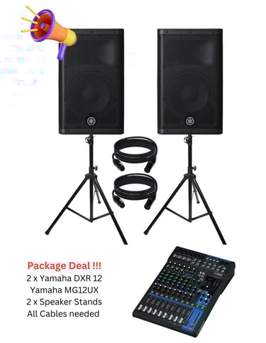 All-inclusive package deal, to cover up 150 ppl. Includes 2 x Yamaha DXR12 speakers, 2 x Speaker stands (and scrims), 1 x Mixer 10CH with FX, all the cables needed.